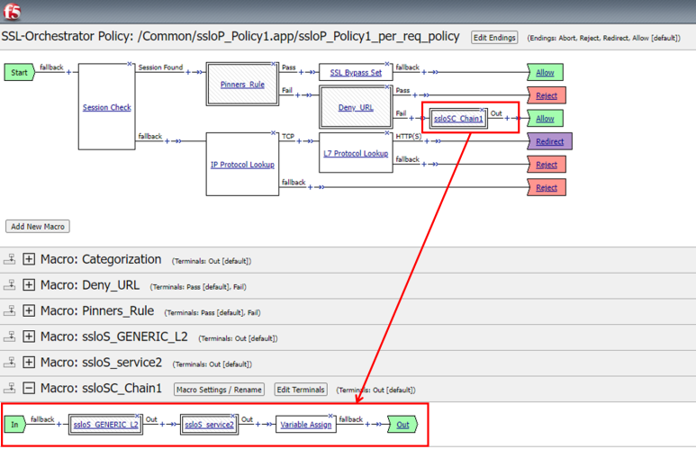 그림에서도 느껴지듯이 2개의 체인이 적용되었음을 확인이 가능했고Policy 메뉴에서 살펴보면 서비스 플로우에서 Chain 에서 2개의 서비스가 적용되어 있음이 확인가능합니다.