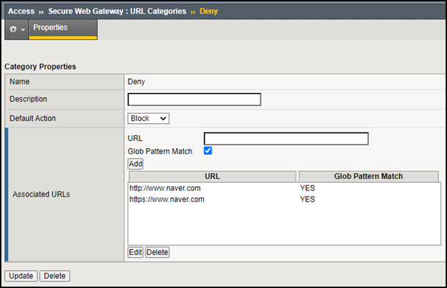 메뉴 에서 Deny 라는 카테고리를 생성하였고 (네이버 주소 차단)