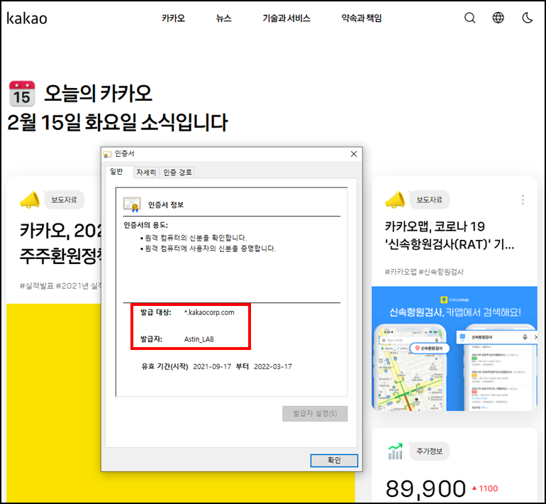 발급자가 Astin_LAB으로 정상적인 Forward Proxy 동작을 하고있음을 확인하였습니다.