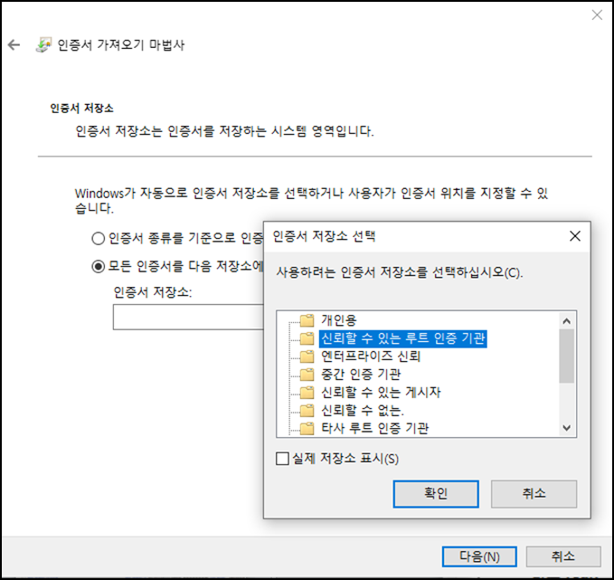 이제 테스트를 위해서 앞서 만들어 놓은 인증서를 클라이언트에 설치하고 테스트를 진행해 보겠습니다.