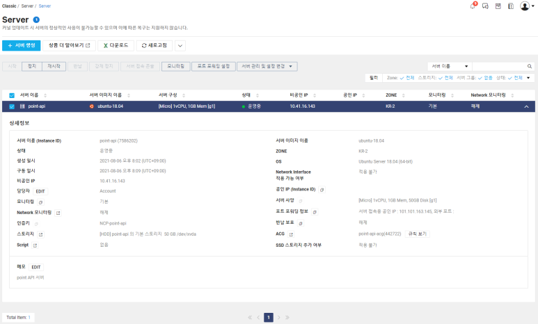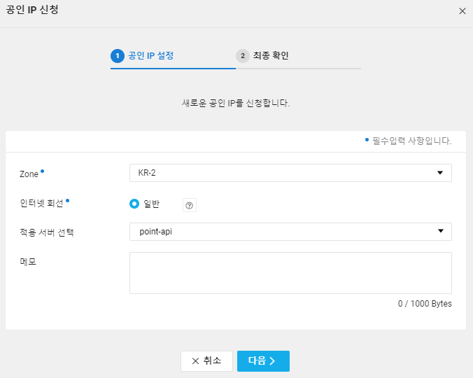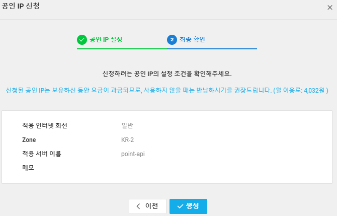 생성할 zone과 서버를 택하면 공인 ip가 할당됩니다.