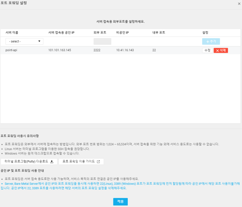 클라우드 서버는 사설ip대역으로 먼들어잘 것이기 때문에, 외부에서 서버 접근시에는 공인ip가 필요하고 포트 포워딩 설정이 필요합니다.