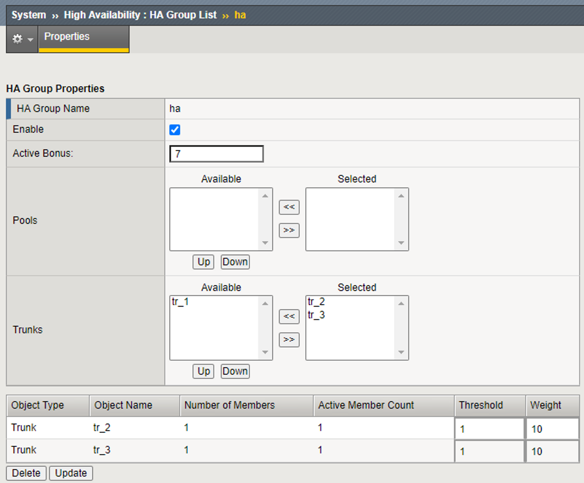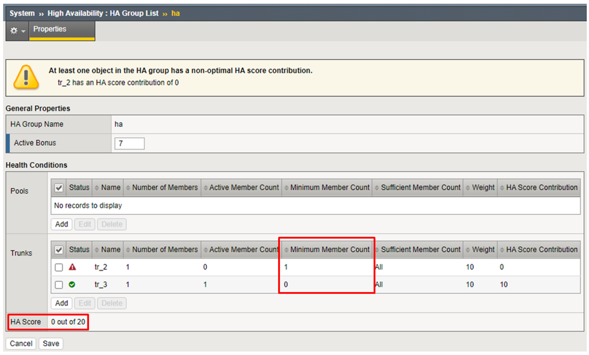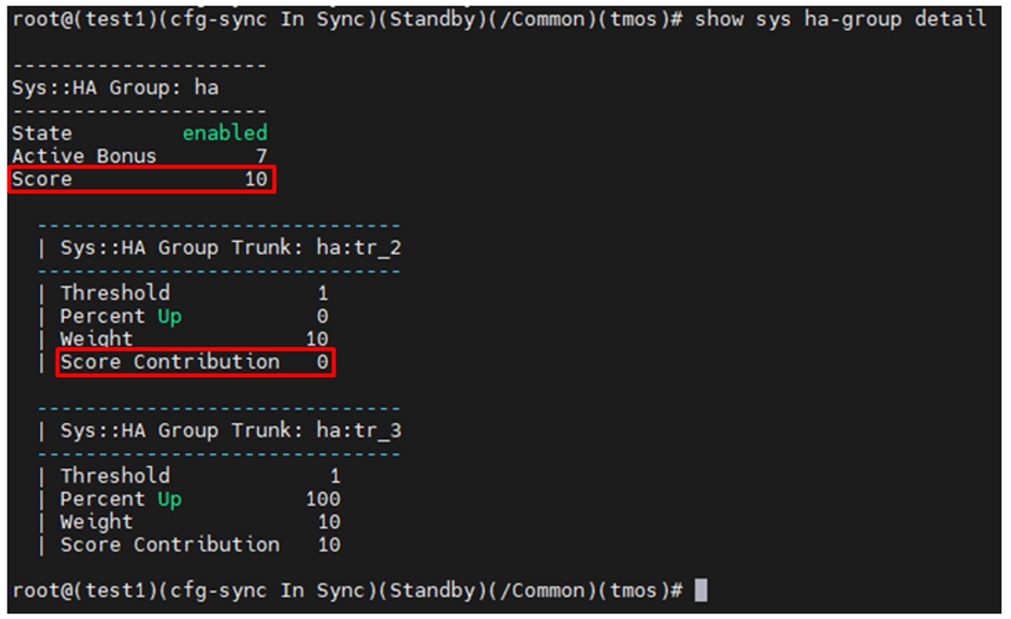 Beginning in BIG-IP 13.0.0, if fewer than the minimum-threshold of objects within a component are available, then both the monitored component score and the total HA group score are set to 0.