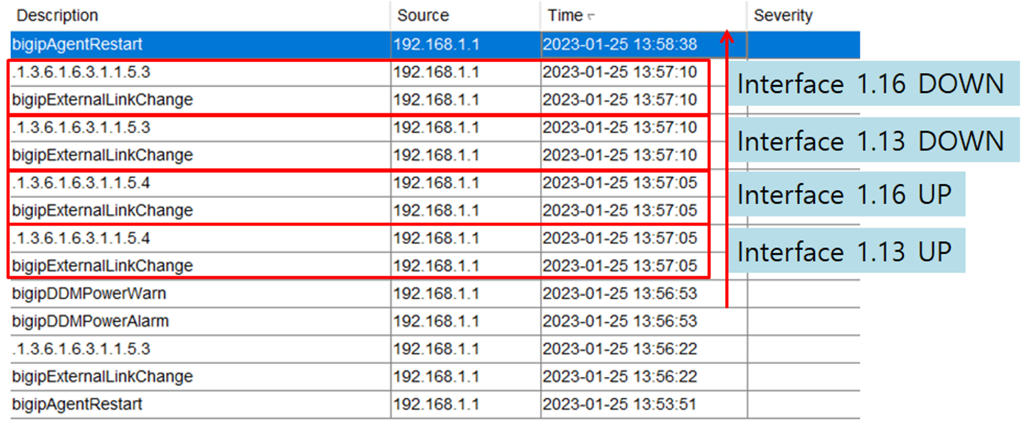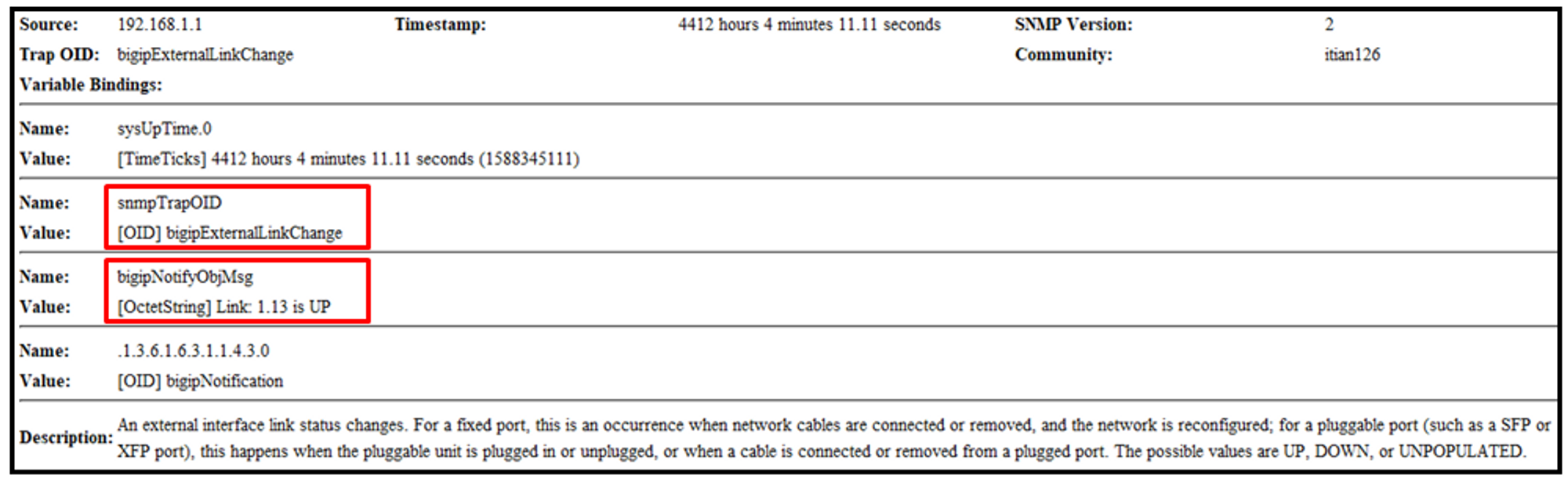 따라서, SNMP 서버에서는 bigipExternalLinkChange 에서 bigipNotifyObjMsg 정보를 파싱해야된다.
