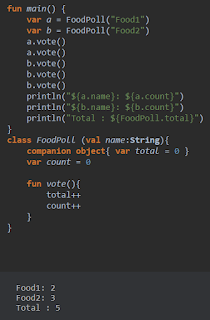 서로 다른 인스턴스 임에도 companion object인 total을 공유 하므로 모든 인스턴스에서 투표수를 누적 할 수 있다.